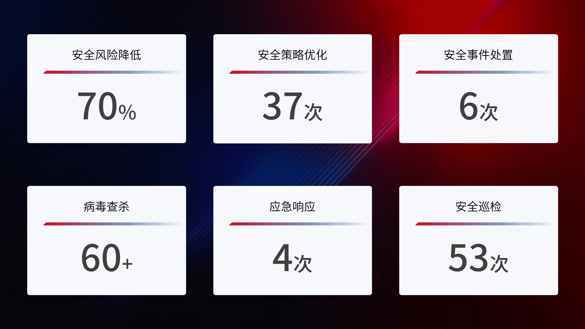 提供全面的安全事件报告体系,,包括处置报告、、、周报、、季度和年度总结,,结合持续监控,,,,帮助客户深入了解网络安全状况。。。。
