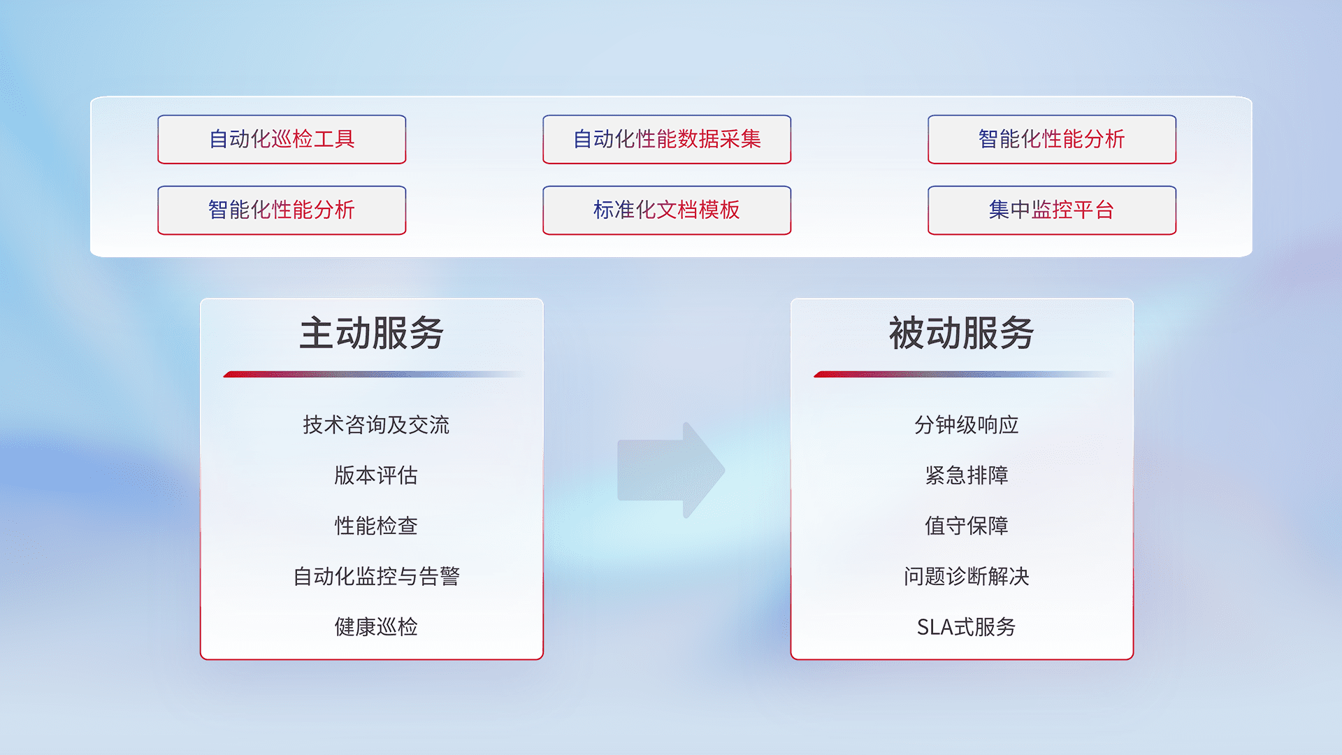 智能化工具和标准化文档,,保障服务质量,,提供主动服务(包含技术咨询、、、版本评估、、、、性能检查、、自动化监控与告警、、、健康巡检)和被动服务包含(分钟级响应、、、、紧急排障、、、、值守保障、、、问题诊断解决、、SLA服务)。。。。